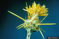 yellow starthistle bud weevil (Bangasternus orientalis) adult(s) on yellow starthistle (Centaurea solstitialis)