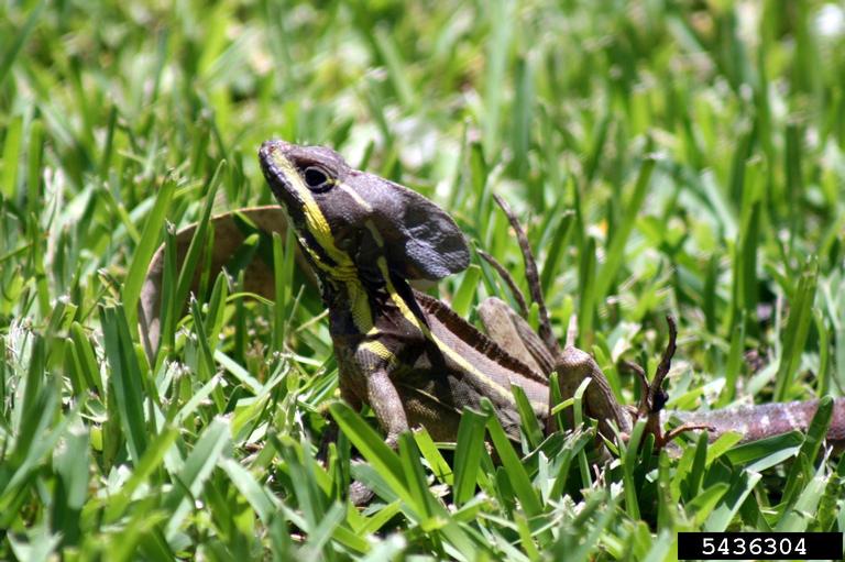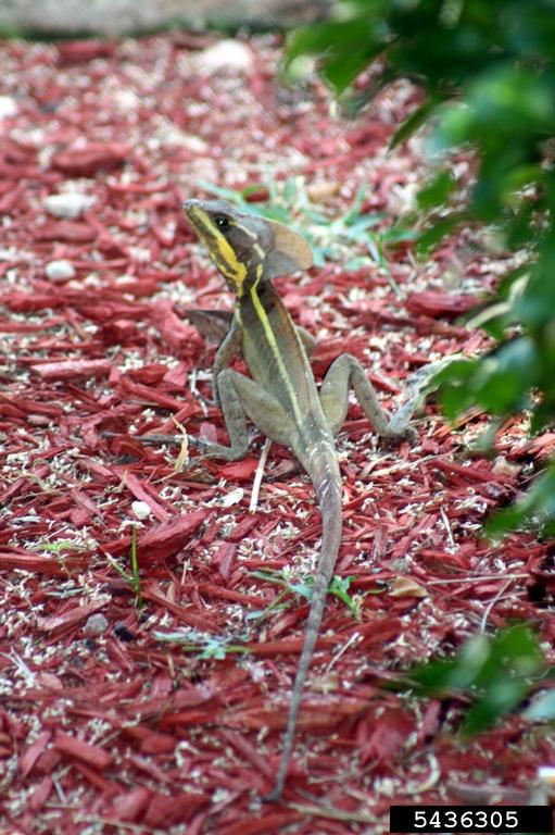Origin Basiliscus vittatus is native from central Mexico, through Central America and into northern Colombia. Brown basilisk were accidentally introduced to the United States in southern Florida through the pet trade. Life Cycle Coloration is brown or olive-brown with black crossbands. Male brown basilisk have a large flaplike crests that extend from the back of the head to the neck and are slightly larger than females. B. vittatus reach sexual maturity less than a year after hatching. Female brown basilisk choose the nesting site for their 3-12 eggs, and after laying no parental care occurs. Young hatch during the rainy season approximately 55-65 days after laying. Distribution Brown basilisk are found in central and southern Florida. Control Efforts No removal methods are currently practiced. https://animaldiversity.org/accounts/Basiliscus_vittatus/ http://reptile-database.reptarium.cz/species?genus=Basiliscus&species=vittatus