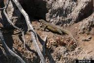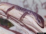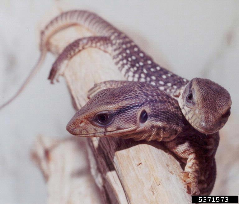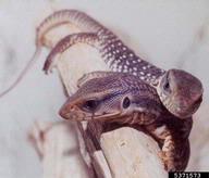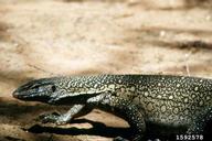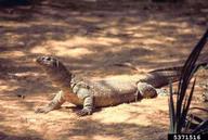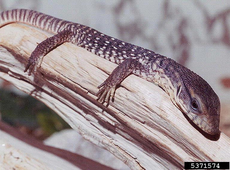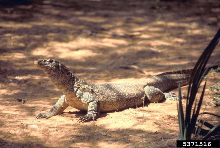 This large lizard can grow to more than 5 ft (1.5 m) in length with a gray-brown body with bands of lighter-colored spots with speckles between them. Nile monitors have muscular bodies with long tails that assist in swimming. V. niloticus are opportunistic predators that will consume any prey they can overtake, including eggs of birds, alligators, crocodiles, turtles, and household pets. They may impact threatened and endangered species including burrowing owls and sea turtles. Female Nile monitors bury approximately 12-13 eggs for smaller lizards and 53-60 eggs for larger individuals. V. niloticus can live up to 10-15 years in the wild.