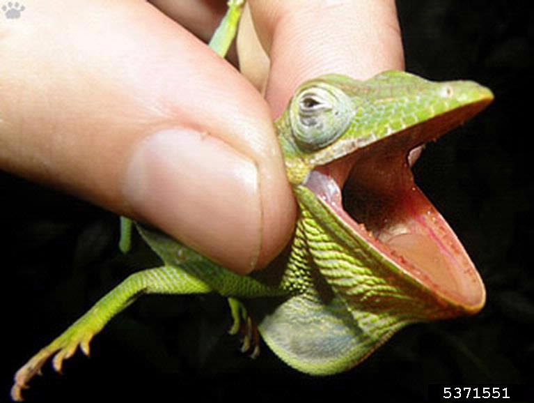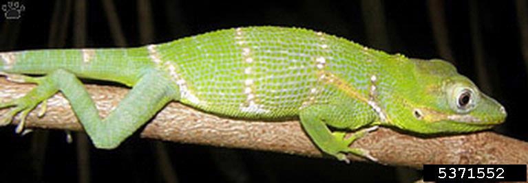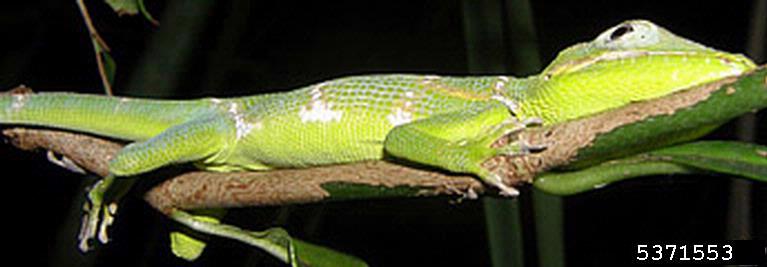 Origin Anolis equestris is native to Cuba. Knight anole were introduced to the United States through the pet trade. Life Cycle Bright green in color, both sexes possess a pink dewlap and yellow stripes below the eyes and onto the shoulder. There is sexual dimorphism with males changing color to a dull grayish-brown. Knight anoles are the largest of the Anolis spp. with males slightly larger than females with sizes of 13-20 in. (33-51 cm) in length. Knight anole breed once yearly in the summer months. Little is known about the breeding behavior of A. equestris. Knight anoles are diurnal. Distribution A. equestris distributions are confined by temperature as they cannot tolerate cold temperatures. Knight anole were introduced into the southeastern sections of Florida with current breeding populations in 11 counties. Control Efforts Avoiding the transportation of A. equestris is key to reducing its spread. Little can be done for established, breeding populations. If you choose to have a knight anole as a pet in Florida, do your research before buying and remember, Don’t Let It Loose! Surrender unwanted exotic pets at one of FWC’s Exotic Pet Amnesty Day events or call the Pet Amnesty hotline at 1-888-IVE-GOT1. http://www.iucngisd.org/gisd/species.php?sc=1619 https://animaldiversity.org/accounts/Anolis_equestris/ https://fl.audubon.org/news/species-spotlight-knight-anole