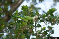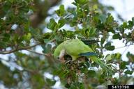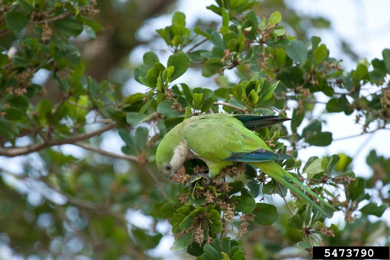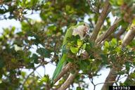 Origin Myiopsitta monachus is native to South America. Monk parrots were introduced to the United States in the 1960s as intentionally released or escaped pets. Life Cycle Adult parrots are slightly smaller than other parakeets at 11.5 in. (29 cm) in length and a wingspan of 18.8 in. (48 cm). M. monachus are green in plumage with a gray face and breast as well as blue primary and outer secondary flight feathers. Sexes are not identifiably different in appearance. M. monachus are the only member of the parrot family to build nests out of sticks and to live in colonies. In its non-native range, Monk parrots live in urban and suburban landscapes with nests on structures such as utility poles. Nest structures are very large and can weigh more than a ton. Each nest structure can contain up to 20 different nesting chambers where females lay 5-8 eggs per clutch. Distribution Monk parrot populations occur in several states including California, Arizona, Texas, Louisiana, Illinois, New York, Florida, and Rhode Island. M. monachus can tolerate temperate climates which has allowed it to become established all over the United States. Control Efforts One form of control includes removing nest sites on man-made structures and providing alternative nesting sites in cities. There is debate on the appropriate form of management due to experts disagreeing on whether monk parrots are a nuisance in cities and agriculture. http://www.tsusinvasives.org/home/database/myiopsitta-monachus https://www.allaboutbirds.org/guide/Monk_Parakeet/lifehistory
