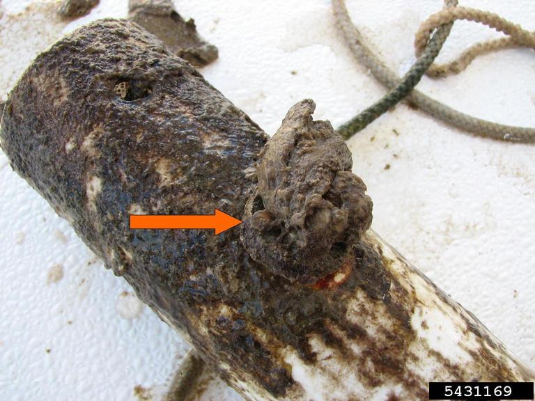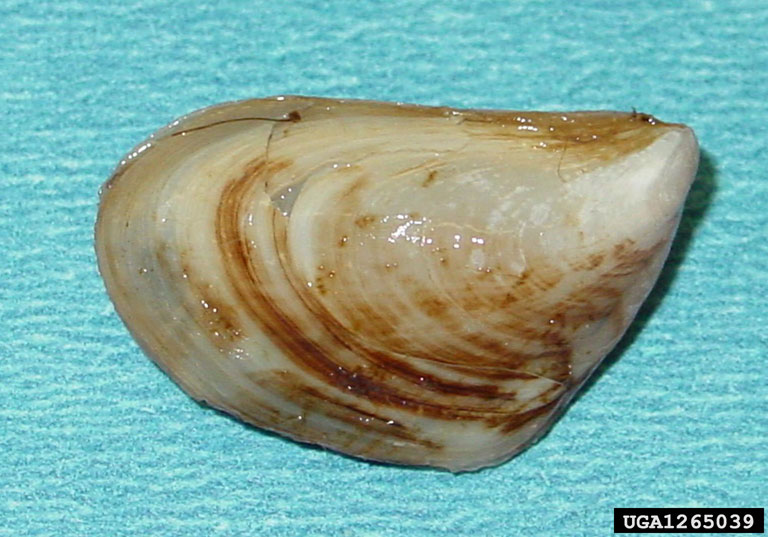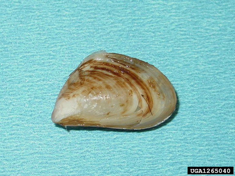 OriginDreissena bugensis or Quagga mussels are filter feeders native to the drainage basins of both the Dneiper River in the Ukraine and the Caspian Sea. It usually has light and dark brown stripes in an alternating pattern. However D. bugensis can also be solid light or dark brown. D. bugensis are rarely more than 2 in. (5.1 cm) in length. There are two phenotypes of this mussel. One form has a high flat shell and usually attaches itself to objects and forms colonies of D. bugensis. The other form has a more elongated shell and often buries itself in the sediment, extending its syphon upward to capture particles of food.Life CycleD. bugensis eggs hatch then go through planktonic larval stages for up to 4 weeks. Larvae are usually moved by water flow, but may be aided by cilia action. Once larvae are large enough they develop into their juvenile stage. At this point they settle to the bottom and search for a substrate to attach to by a cluster of threads called a byssus. A single reproductively mature female may produce as many as a million eggs per breeding season.DistributionD. bugensis is replacing zebra mussels where their populations overlap. D. bugensis has spread throughout Eastern Europe and parts of North America. They can be found in the Great Lakes and the Mississippi and Ohio Rivers.Control Efforts Most of the research done on controlling mussels has been focused on Dreissena polymorpha. However many of the control methods used for D. polymorpha should also work well for D. bugensis. Preventing infestations of D. bugensis by proper ballast water management including mid-ocean exchange and disinfection should be always be used. Physical removal by high pressure washes should be effective. Freezing, heating to high temperatures and desiccation should also control D. bugensis.