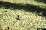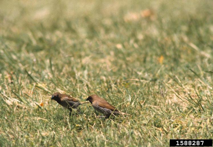 L. punctulata plumage is primarily brown with adults having distinct scale-like feathers on the breast and belly. Nutmeg mannikin forages in large flocks on seeds, berries, and insects. Females lay 3-5 eggs with both sexes participating in incubation for approximately 14 days. Fledging occurs after about 18 days.