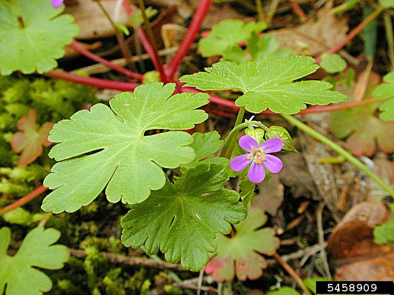 AppearanceGeranium lucidum grows predominantly as an annual weed though it may become biennial depending on moisture conditions.Foliage Stems are red colored growing from a weak central root. Leaves are rounded, deeply lobed with a waxy appearance that makes dense infestations easy to recognize.Flowers Flowers are pink with 5 petals and grow interspersed with the leaves; rather then above them.Fruit The seeds are small and rapidly transported to un-infested areas on boots, vehicles, and by wildlife.Ecological ThreatGeranium lucidum grows in the Pacific Northwest predominantly as an understory species intermixed with grasses, forbs and moss.