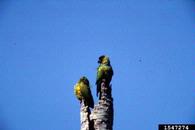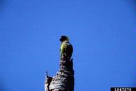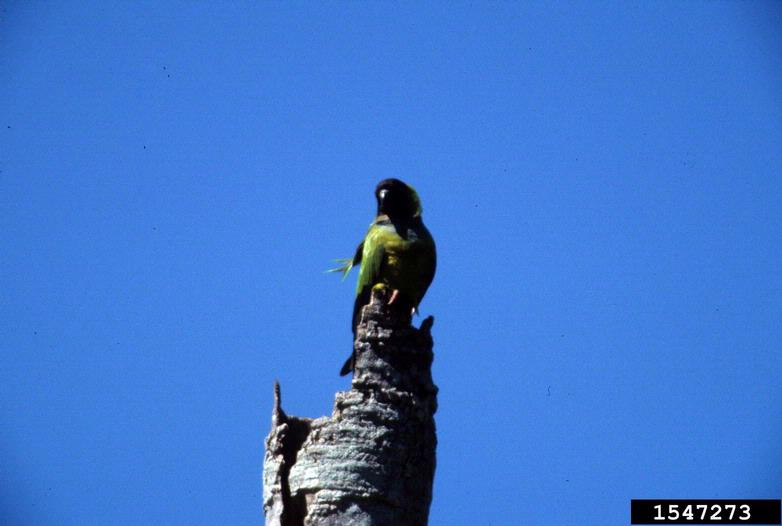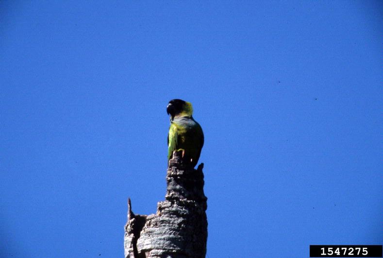 Origin Nandayus nenday is native to Neotropical South America. A popular pet bird, black-hooded parakeets were introduced to the United States by escaping enclosures or intentional releases. Life Cycle N. nenday are approximately 12 in. (30 cm) in length and weigh 5 oz (140 g). Plumage is bluish-green on the chest with black feathers on the head and a black beak. Feathers on the thighs are red. Females are smaller than males with a more curved beak. N. nenday gather in large communal roosts outside of breeding season. During nesting season, females lay 3-5 eggs in a clutch with nests found in holes in trees. Distribution N. nenday have established large breeding populations in California, Texas, and Florida. Control Efforts Large populations of N. nenday could pose a threat to crops. However, limited problems have been reported. https://www.parrots.org/encyclopedia/nanday-conure